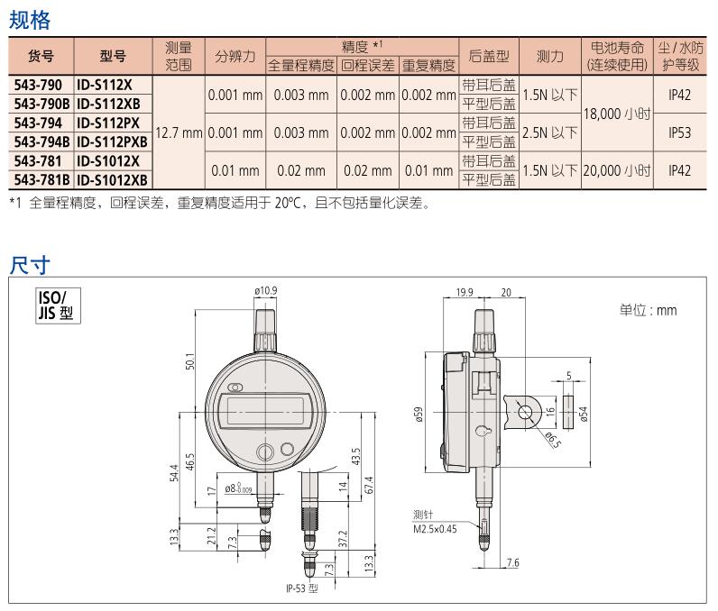 • 功能简捷便于使用的低成本设计型指示表, 拥有各种分辨力为 0.01mm 、 0.001mm 型机型, 543-794/94B 的尘 / 水防护等级达到 IP53 ( 只限分辨力 0.001mm 型 ) ,使用纽扣式 电池 ( SR44 ) 。