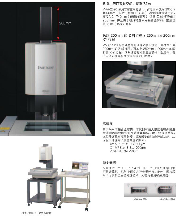 新款iNEXIVVMA-2520专为测量三维工件而设计。尽管本仪器小巧轻盈,仍然具有长达200mm的Z轴行程和73.5mm的工作距离,能十分方便地对机械部件、注塑模件、金属冲压件、电子设备、模具和医疗设备进行Z轴测量。标准的10倍变焦光学系统符合“高放大倍率时具有极高的分辨率,低放大倍率时具有广阔的视场”这一严苛的行业要求。低失真光学系统和高光强白色LED照明光源增强了对比度,提高了仪器的测量效率。即便对于带有多种颜色的部件,这样的设计组合仍能确保实现可重复测量。