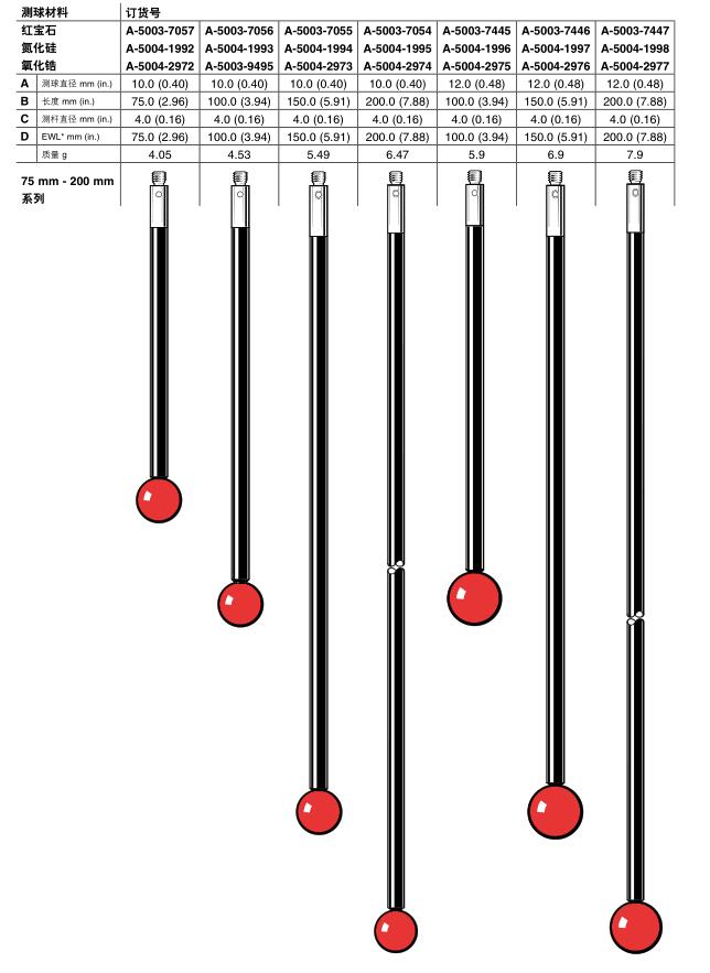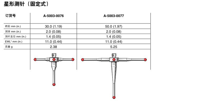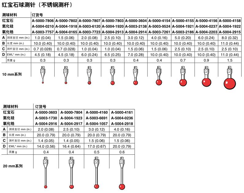 下列测头全部使用M2螺纹的测针,但配备适当的转接头也可使用其他螺纹规格的测针。
