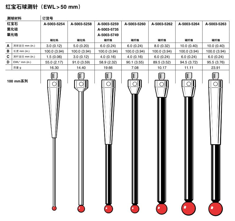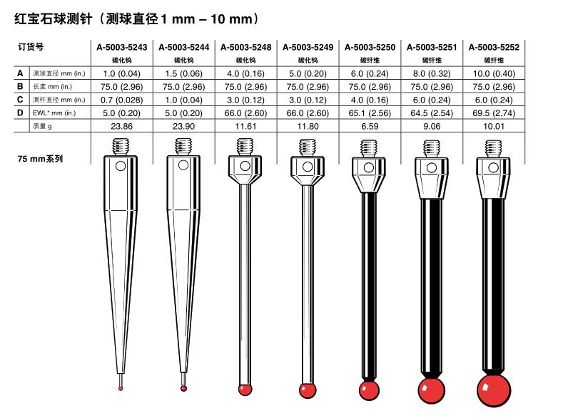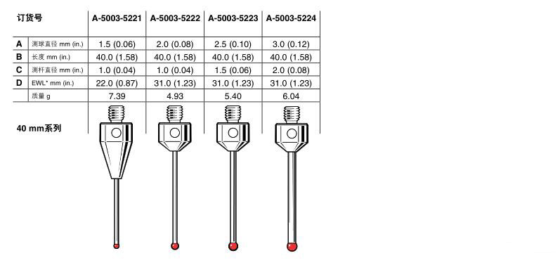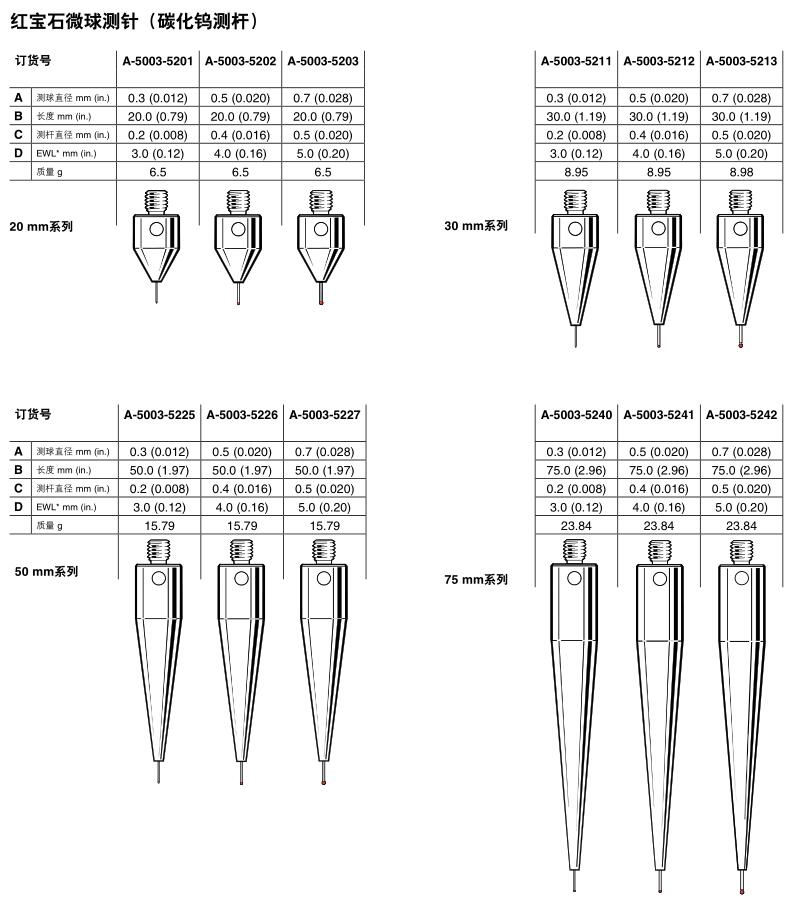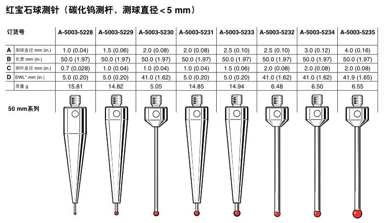 下列测头全部使用M5螺纹测针,但配备适当的转接头也可使用其他螺纹规格的测针。
